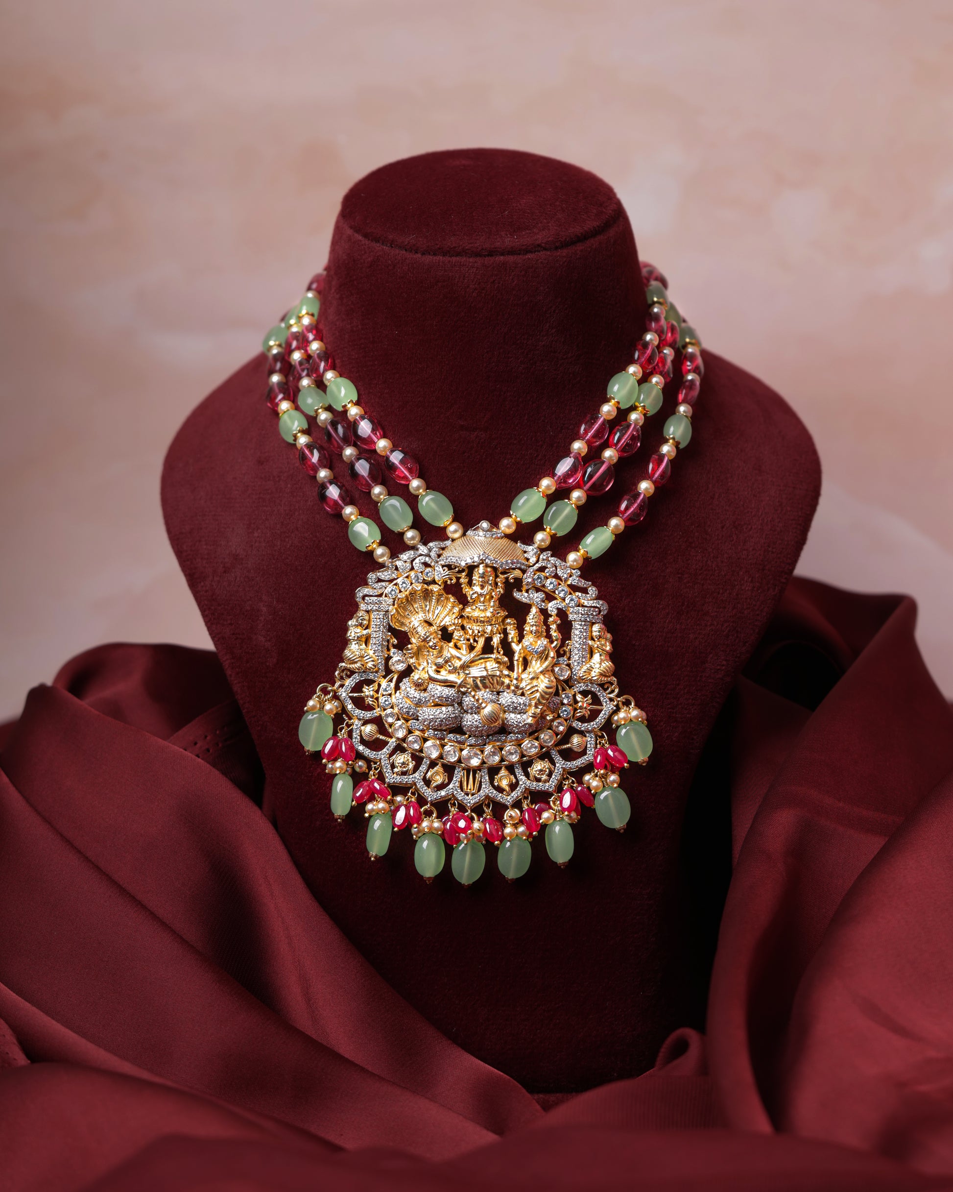 An elegant beaded pendant necklace featuring a harmonious blend of pastel stones, pearl strands, and intricate handcrafted detailing. Designed with layered textures and a statement centerpiece, this piece brings together traditional artistry and modern styling—perfect for festive occasions, wedding functions, and elevated ethnic looks.