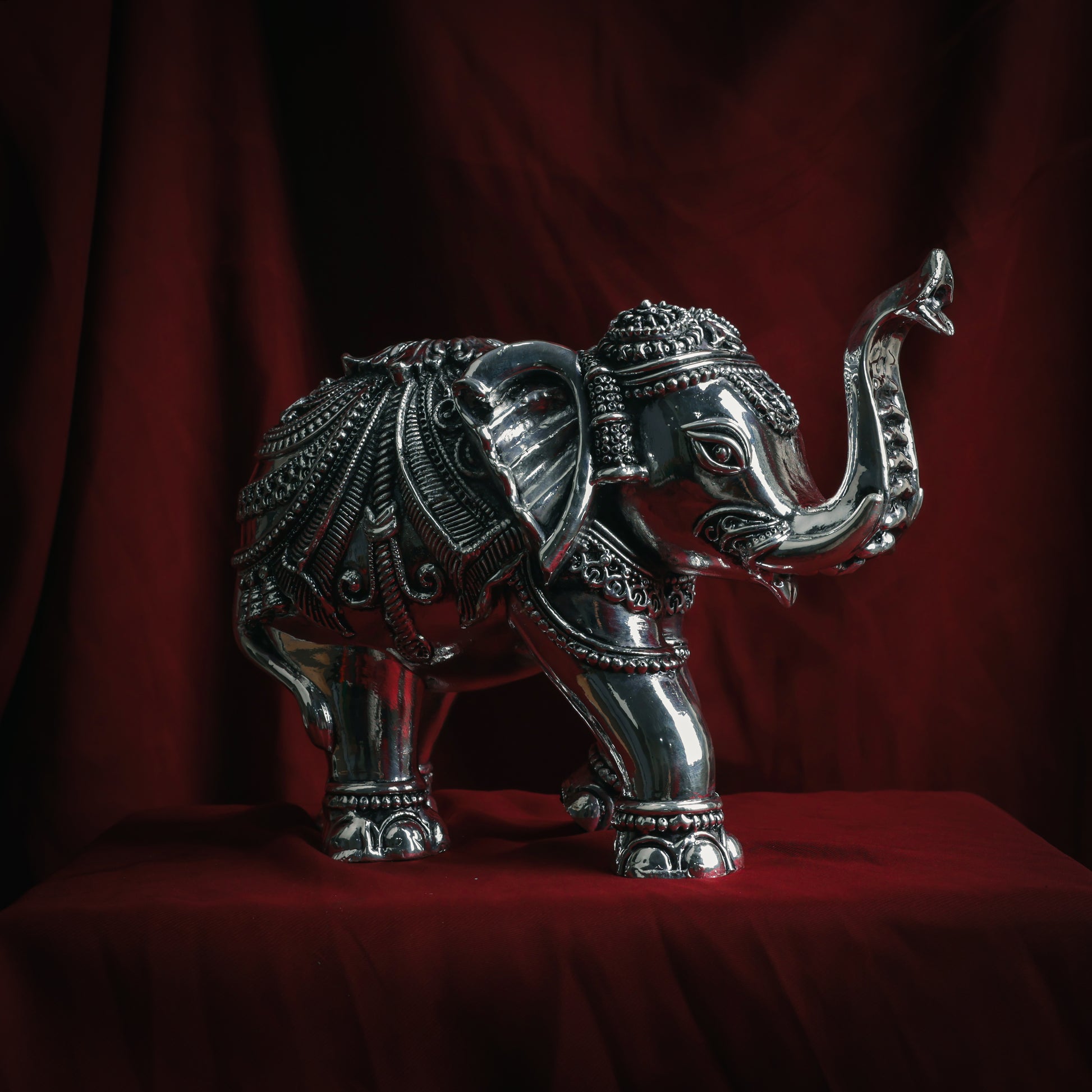 A finely sculpted silver elephant symbolizing strength, wisdom, and prosperity. With intricate ornamental detailing and a majestic stance, it brings timeless elegance and positive energy to refined interiors and meaningful gifting.