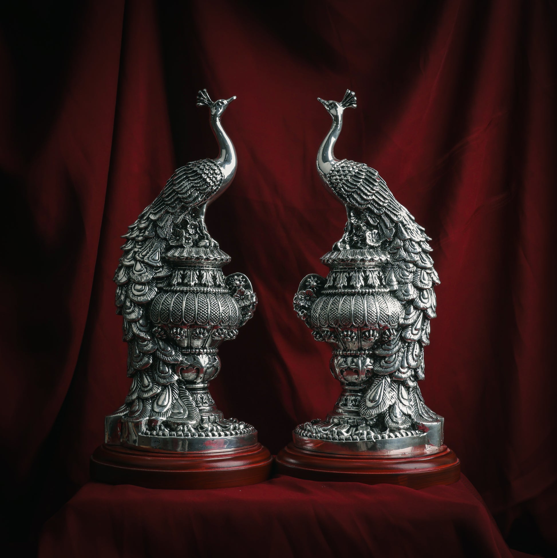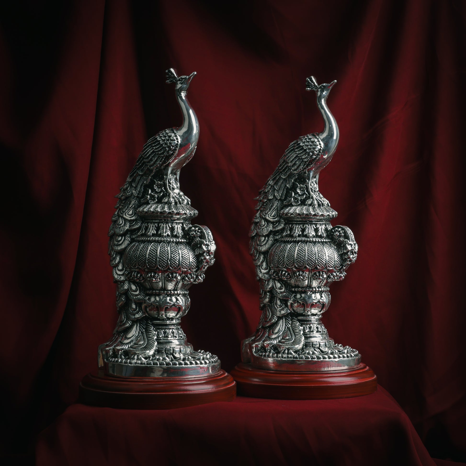 A majestic pair of finely sculpted silver peacocks, embodying grace, pride, and timeless grandeur. Resting on intricately detailed royal bases, this statement creation reflects heritage craftsmanship and refined luxury — perfect for elevating distinguished interiors and meaningful gifting.