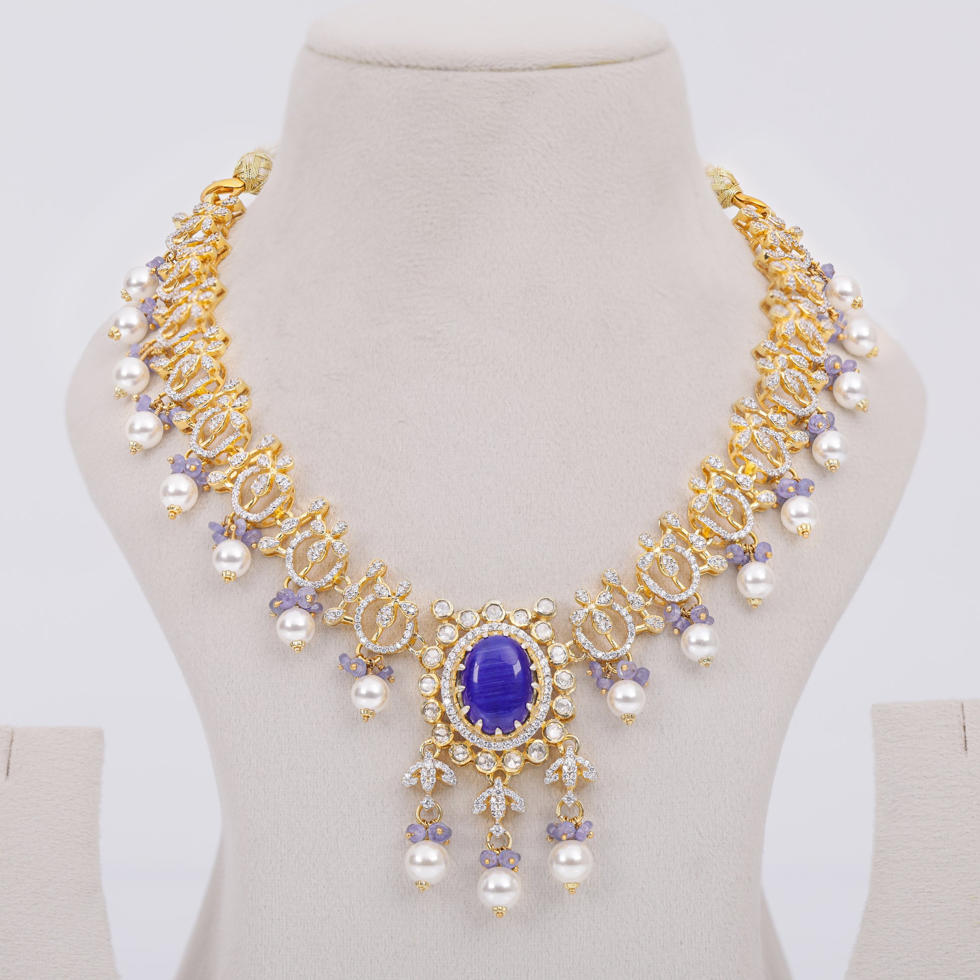 A contemporary pearl necklace highlighted with blue stone accents and refined detailing. Designed for modern bridal styling, receptions, and elegant festive wear.