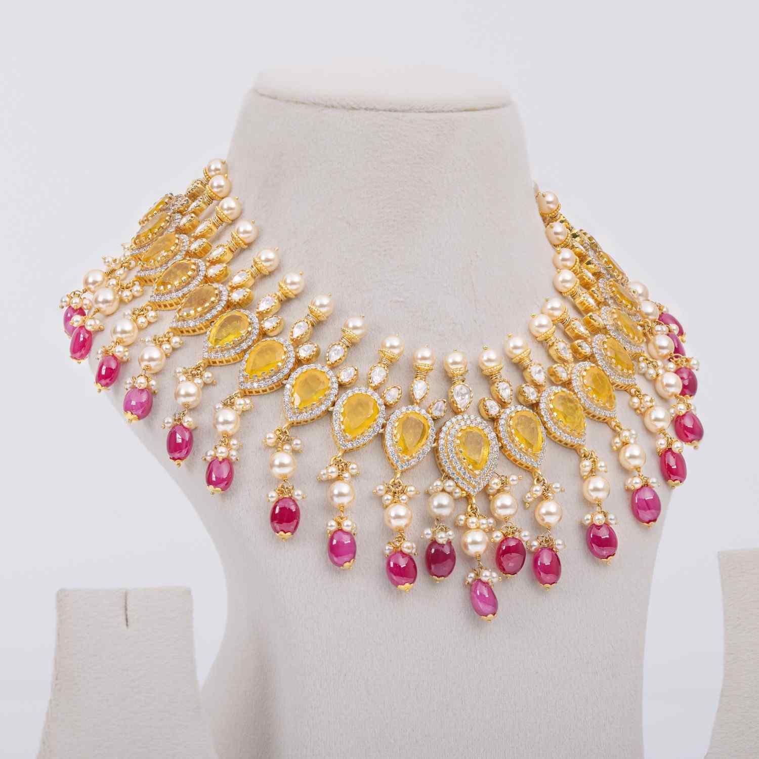 A graceful pearl necklace accented with yellow stone detailing. Perfect for bridal wear, festive occasions, and elegant gifting, combining warmth and classic beauty.